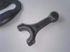 素材の丸棒を一瞬で加熱し、150トンプレスで3回たたくと出来上がる。